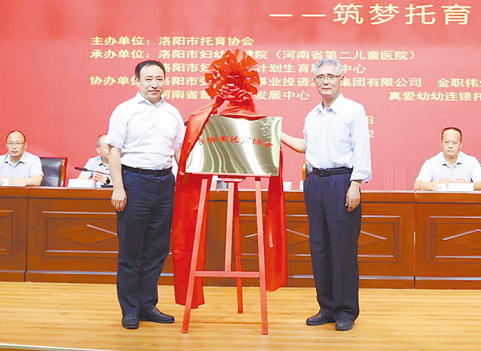 李金乐主任与新当选的托育协会会长、市卫生健康委原二级调研员张永智共同为“洛阳市托育协会”揭牌。