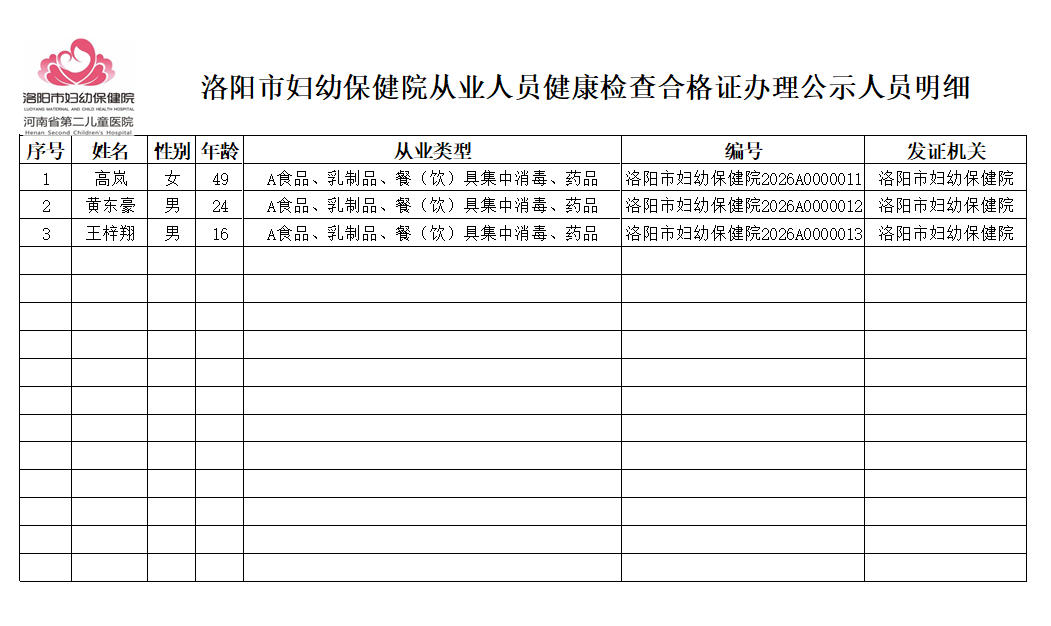 洛阳市妇幼保健院从业人员健康检查合格证办理公示人员明细